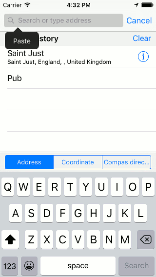 Lahko pa bi bilo lažje izbrati in kopirati te koordinate. Nato izberite zavihek »Naslov« in nato pritisnite dolgo na iskalno polje. Pojavi se gumb za lepljenje, kot je prikazano na spodnji sliki: