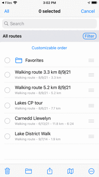 Če želite naložiti vse poti v mapo in njene potomce mape, pritisnite dolgo na element mape na zaslonu poti, da vstopite v izbirni način in izberete mapo. Nato pritisnite ikono zemljevida v spodnji orodni vrstici, da naložite vsebino mape na zemljevidu.