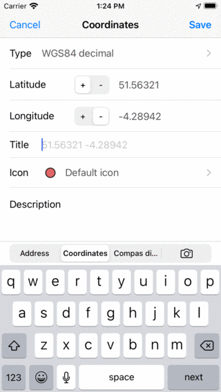 Återigen är vi nöjda med den föreslagna titeln och tryck spara. Koordinaterna sparas och koordinatskärmen rensas, så att du kan ange nästa koordinater.