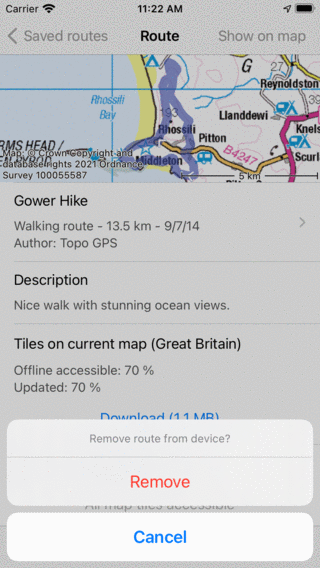 Om du trycker på ”Ta bort” kommer rutten att tas bort från din enhet.