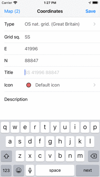 Якщо ви натиснете кнопку «Зберегти», координати будуть збережені як шлях.точка. Екран координат буде очищений, так що ви можете ввести наступні координати. Перші цифри тепер базуватимуться на попередньому введенні. У верхньому лівому куті екрана з’явиться кнопка «Карта», за допомогою якої ви зможете повернутися до карти. Число за картою повідомляє, скільки координат було введено.