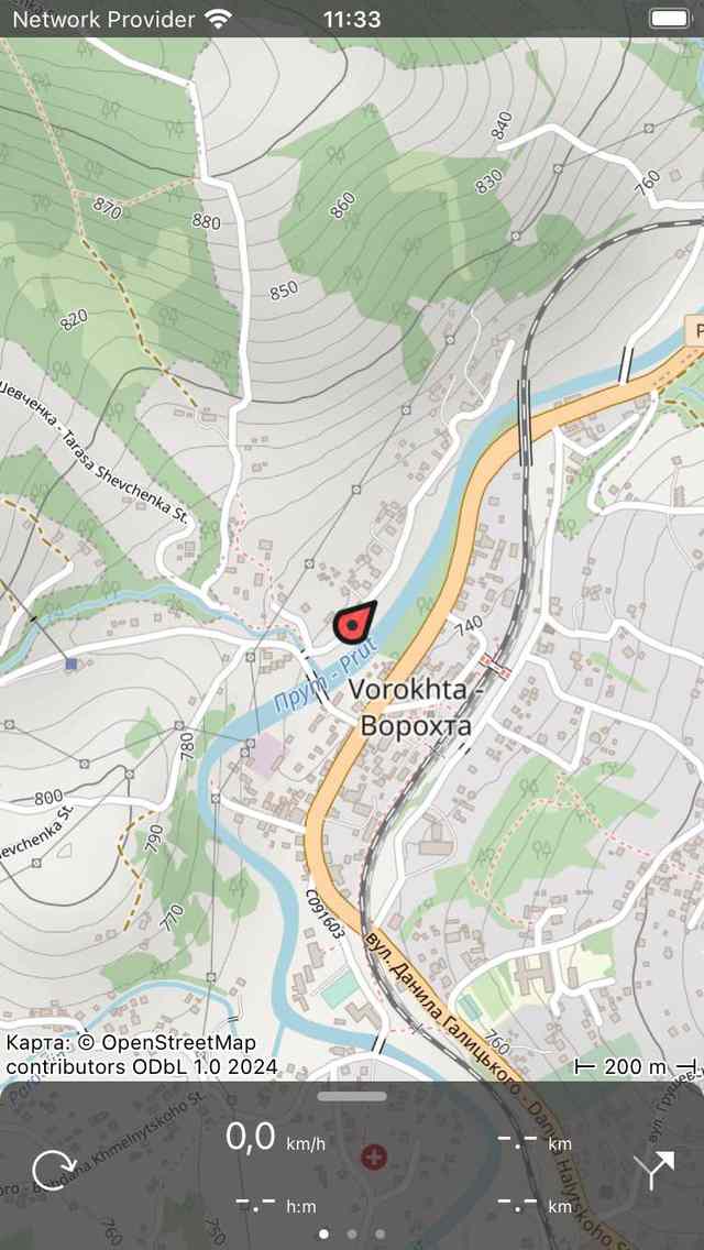 Торкнувшись значка маркера позиції в лівій нижній частині головного екрана, карта буде зосереджена на вашому поточному розташуванні. Приклад показаний на малюнку нижче.
