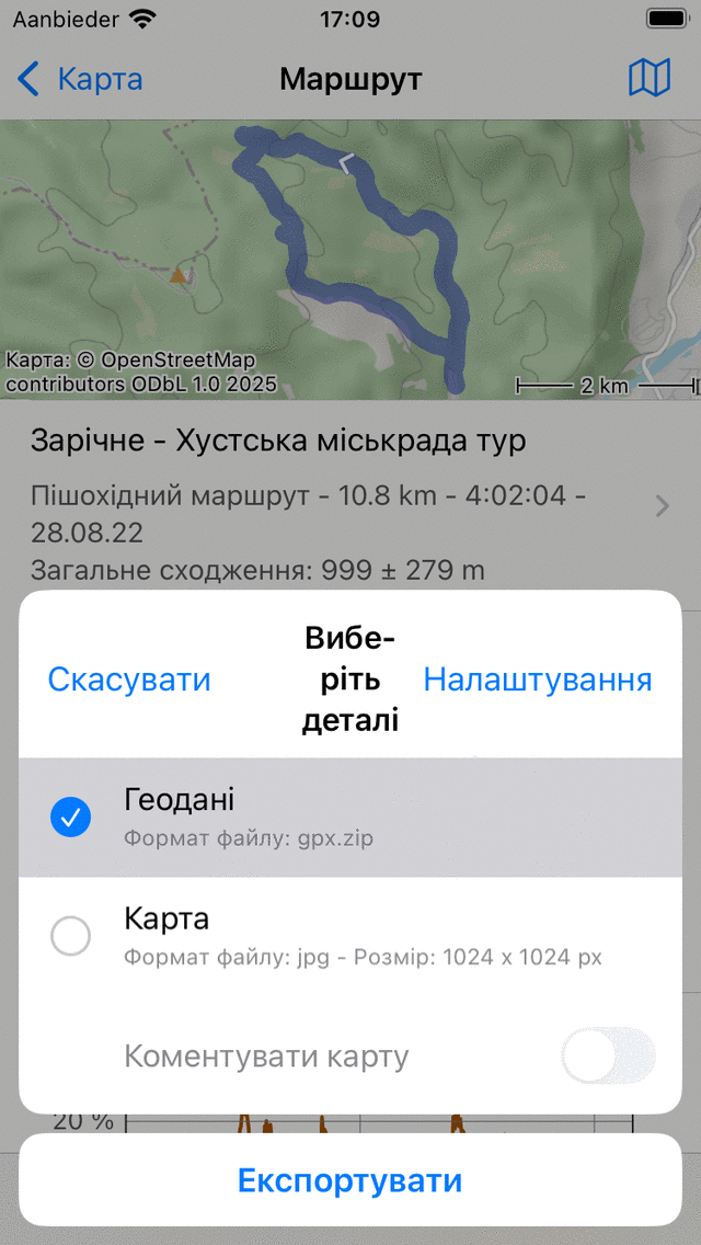 Фотографії: Якщо ви включите «Фотографії», фотографії маршрутів також будуть експортовані. Цей пункт недоступний, якщо їх немає фотографій.