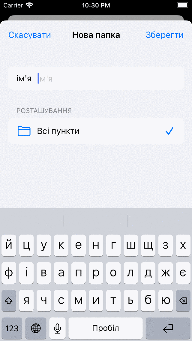 Щоб створити папку, потрібно ввести назву нової папки. Типовим розташуванням новоствореної папки є поточна активна папка на екрані маршрутних точок. Якщо ви хочете створити нову папку в іншій папці, вам потрібно натиснути розділ «Розташування» та вибрати папку. Закінчивши, натисніть «Зберегти», щоб створити папку.
