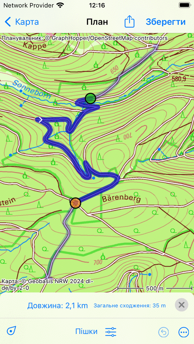 Щоб скоротити маршрут, спочатку довго натисніть на першу або останню точку маршруту. Тримайте палець на екрані і перемістіть точку в потрібне місце. Точку можна переміщати тільки по маршруту. Якщо ви відпустите палець, маршрут буде скорочений, як у прикладі нижче: