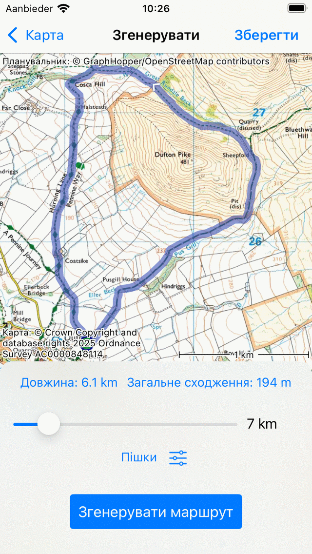 Повзунок внизу визначає бажану довжину маршруту. Якщо ви пересунете повзунок, буде згенеровано новий маршрут. Потрібна довжина відображається в правій частині повзунка. Бажана і актуальна довжина, не завжди точно збігаються. Фактична довжина створеного маршруту відображається над повзунком. Поруч з фактичною довжиною ви бачите загальний підйом маршруту. Якщо ви торкнете його, ви зможете переглянути профіль висоти створеного маршруту.