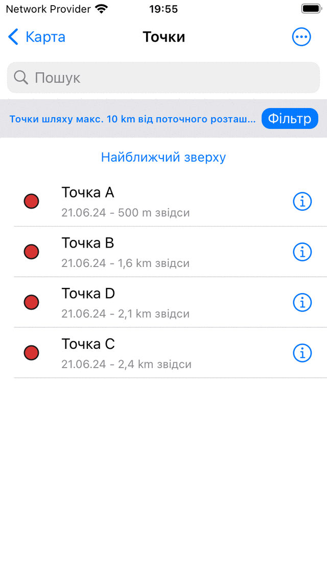 На малюнку вище ви бачите приклад включеного фільтра. Під рядком пошуку ліворуч ви побачите опис поточного активного фільтра. Тут шляхові точки фільтруються за місцезнаходженням, показуються лише шляхові точки в межах 10 км від поточної локації. Якщо торкнутися опису фільтра, ви зможете змінити поточний фільтр. Щоб відключити фільтр, натисніть на кнопку фільтра.